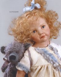 adorned with a bow. She has mouth-blown glass eyes. Her dress is embroidered all over with a knitwear top and ruffle ribbons in different materials. She has an underskirt and knitwear trousers. She wears leather shoes.