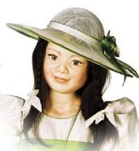 Rose is dressed in an ecru silk dupioni dress with scallop pin tucks and embroidered in apple green to match her dupioni sash. Her underwear is cotton batiste. Her hat is in matching sinnamy with hand-dyed sinnamay trim. Her shoes are leather.
