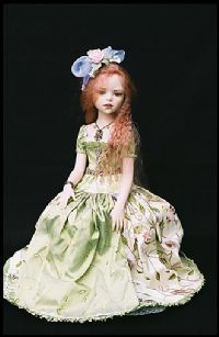 OOAK hand-sculpt from a polymer clay called fimo. She is a young teen dressed in a silk embroidered dress. Dale now makes the dolls so that their heads are movable! She has a chest plate this is now sculpted and attached to a cloth body. This also allows for a nice sculpted back. She has "Masterpiece" eyes that are violet in color. Her wig is hand-dyed mohair. Her hair is adorned with a beautiul hairpiece. Her shoes are also sculpted. She wears a hand-made bracelet. Her necklace adds the final touch! She sits on a decorative box.