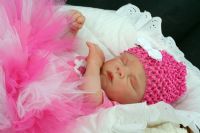 Preemie Baby Lennox is just barely 19" long from head to toe! Her head circumference is ~14". She has 3/4 sculpted arms and full sculpted legs. Baby Lennox has a mix of micro rooted light brown and pale blonde hair in a wavy straight texture. She has just enough hair to pull up into a little curl on top! She has pierced ears and will come with the pink studded earrings as shown in the photo. She is filled with pellets and polyfil. She is dressed in an adorable pink tutu outfit, crocheted booties and hat plus disposable diaper.