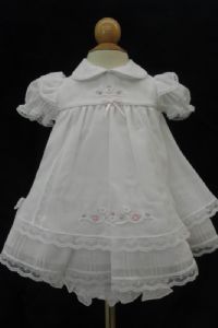 Sweet white dress has beautiful embroidered pink rosette flowers through out the dress, delicate white lace border trim and a sweet white bow accent on each side. Panties included. Poly/Cotton.